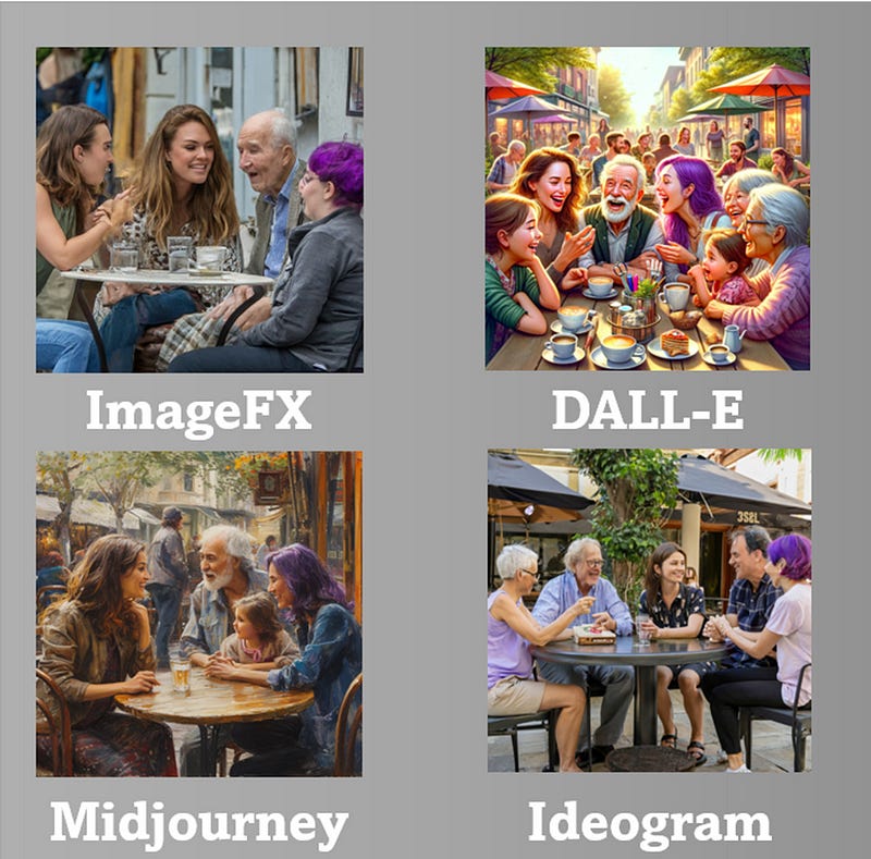 It is difficult for text-to-image tools to represent these multiple-step prompts, as I laid out. None of them got it right, but ImageFX (missing the kid) and Midjourney (missing one woman with brown hair) are the closest. Also, text-to-image tools have difficulty forming accurate faces of multiple people in photorealistic images. Look closely at ImageFX and Ideogram faces, and you’ll see distortions. Midjourney struggles the least.