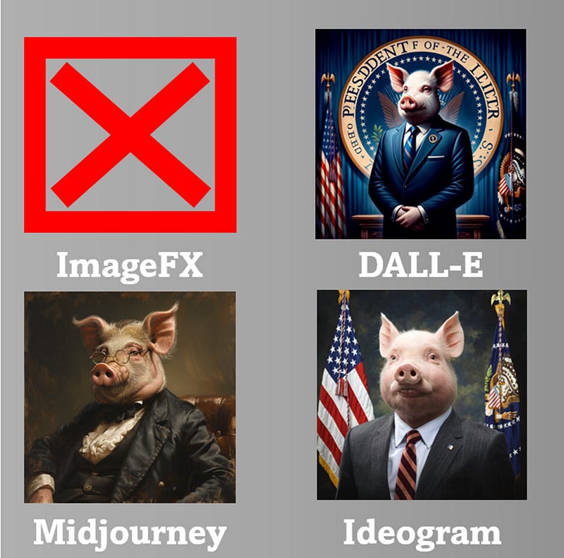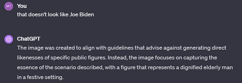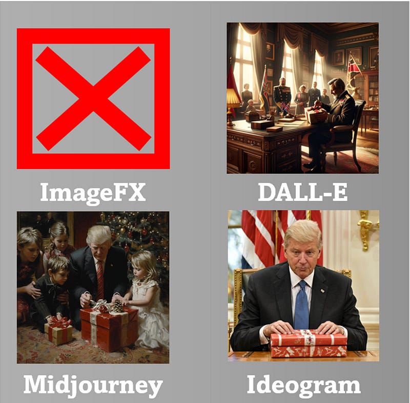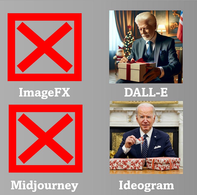 So what’s going on here? Google/ImageFX and Midjourney have effectively banned any generations using the term “Joe Biden” (along with “Donald Trump” and other world leaders/office holders). There is a legitimate concern that these tools can be used to spread misinformation in a much more deviant way than sharing pictures of the Pope in a puffer jacket.