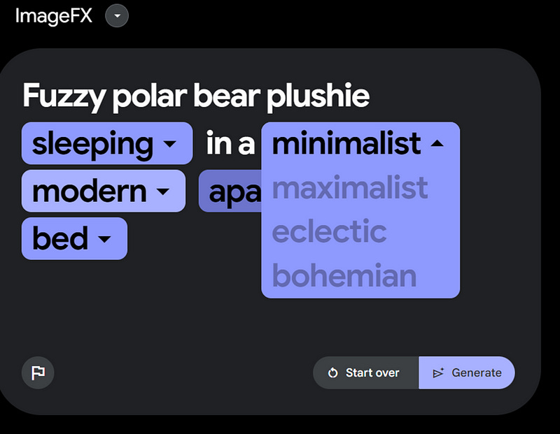 ImageFX- Google’s new service is quite good. After running these examples (and many more) in comparisons, I think it is better than DALL-E or Ideogram. And if you use it through the Google Test Kitchen link, they have a nice feature called expressive chips, which take your original prompt and give you drop-downs for variations it can create. And it’s all free, at least for now.