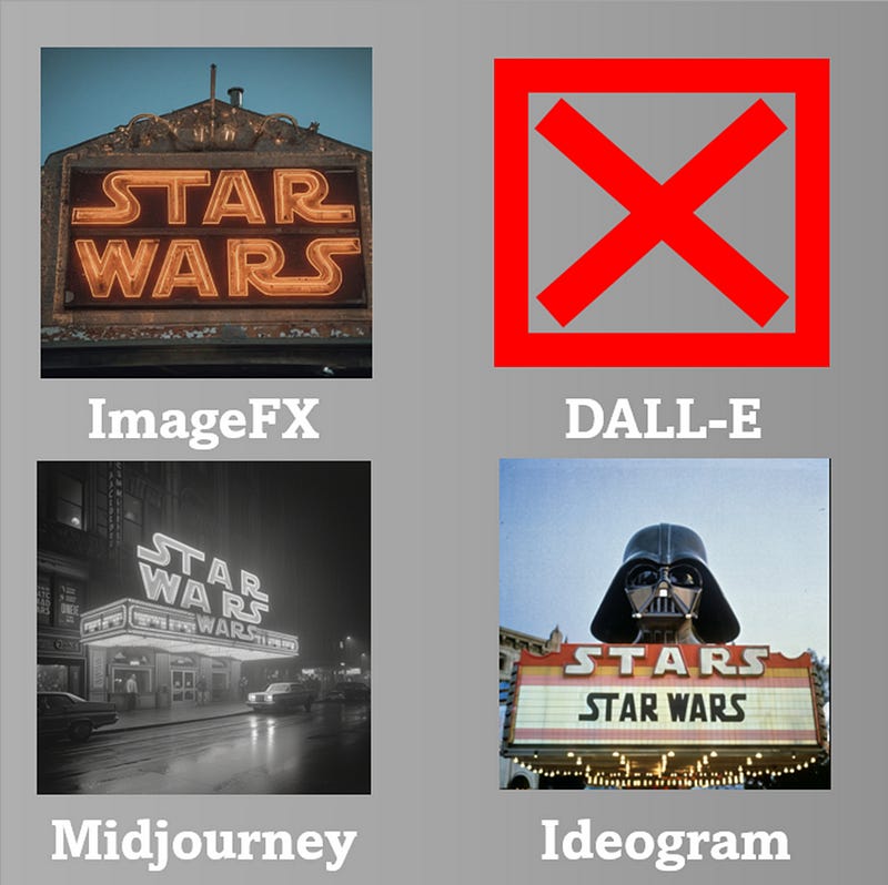 It is impressive that ImageFX, Ideogram, and Midjourney all have the “Star Wars font,” even if you wouldn’t have seen that on a 1977 movie marquee. DALL-E refused to generate this image. OpenAI is clearly afraid of generating anything Disney-related (i.e., they don’t want a lawsuit from “The Mouse”). Even when I explained to DALL-E that I only wanted the words “STAR WARS” on a marquee (which would NOT break any copyrights), it still refused to produce that output.
